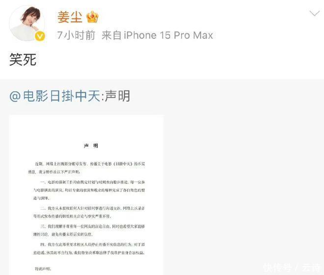 但姜尘还真不是茹素的,径直转发了剧组的清晰,贴上了两个字:笑死。